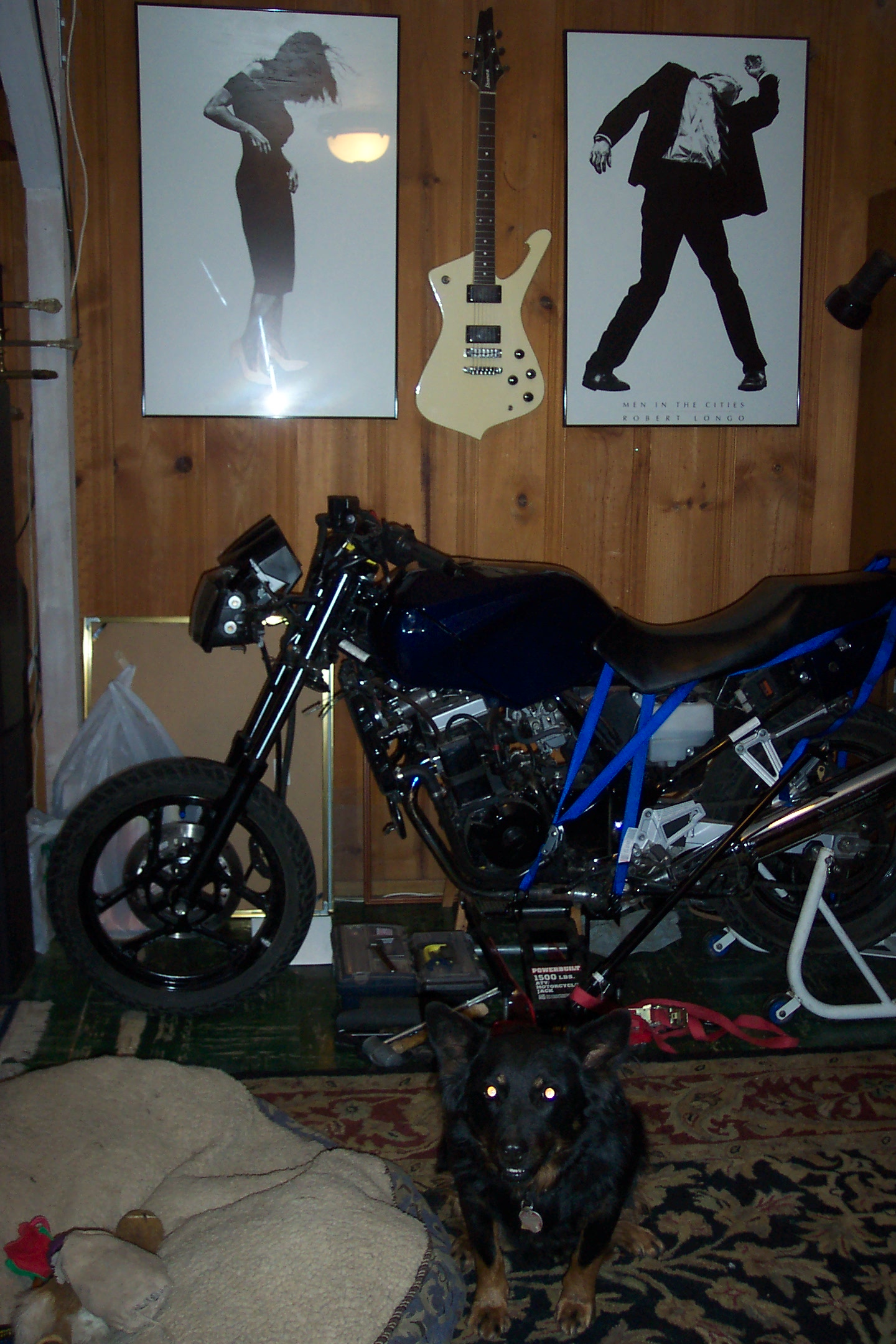 With body removed mounted on jack to allow installation of new forks, also installed race exhaust and lowering link. |